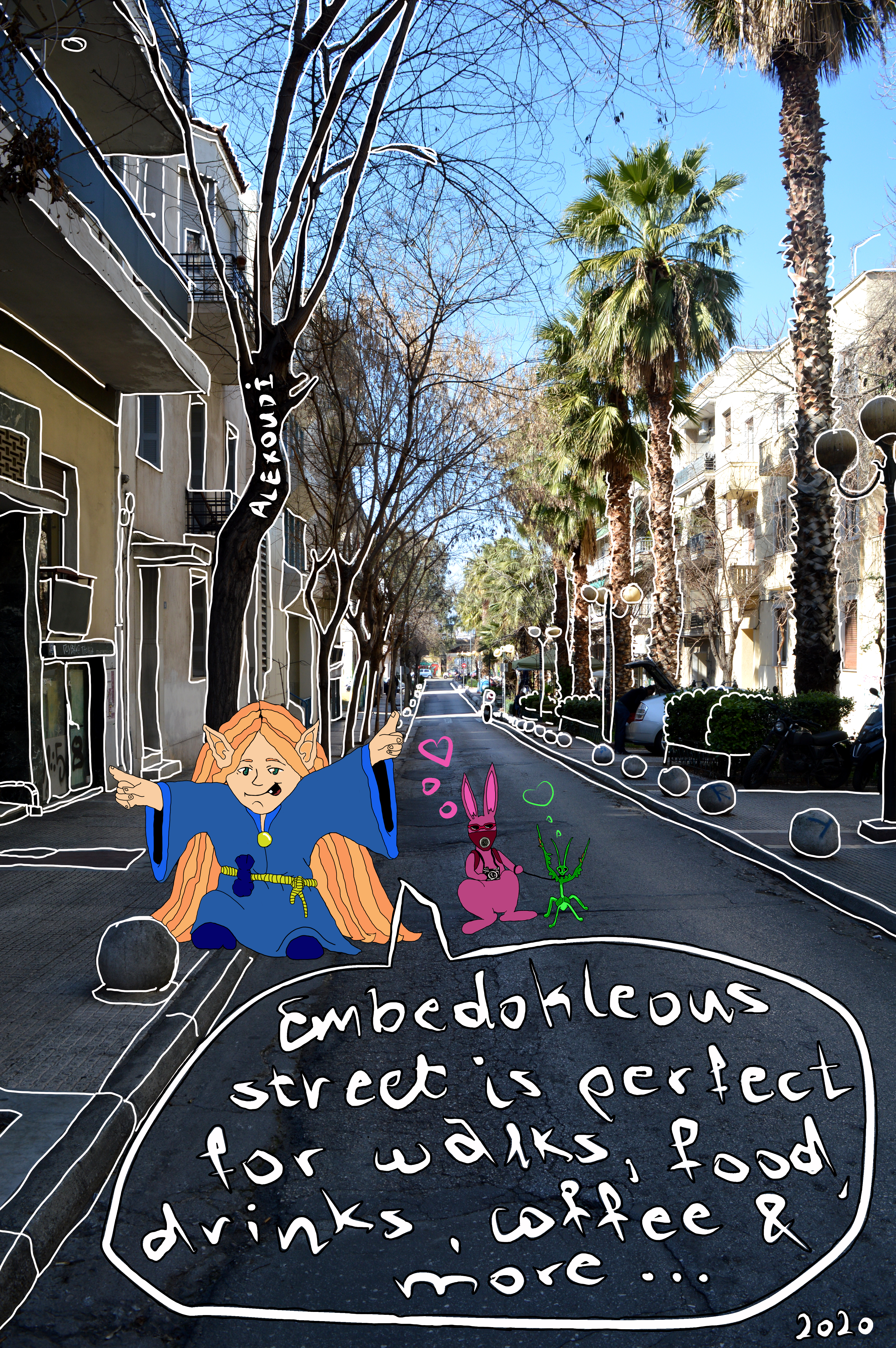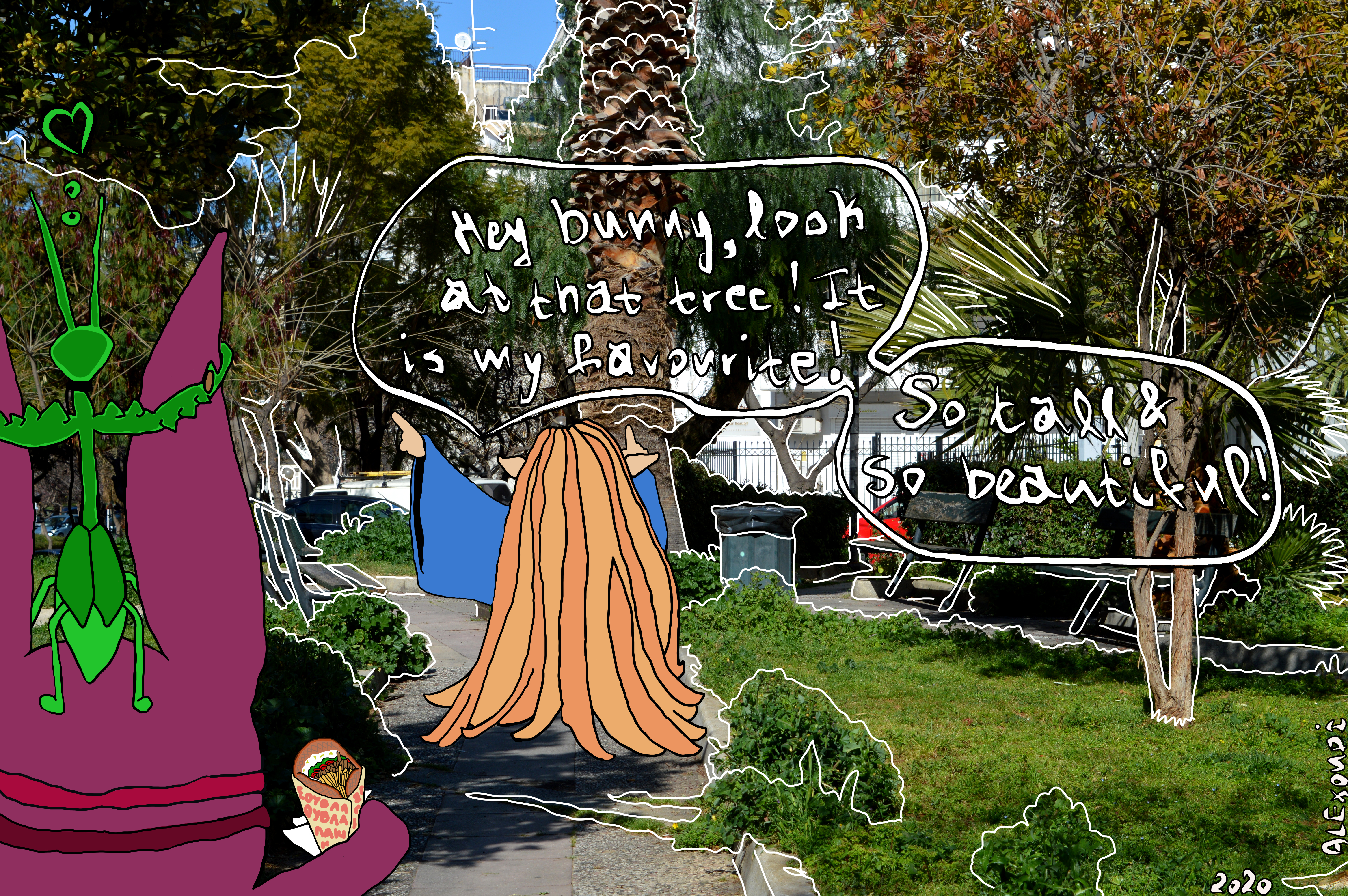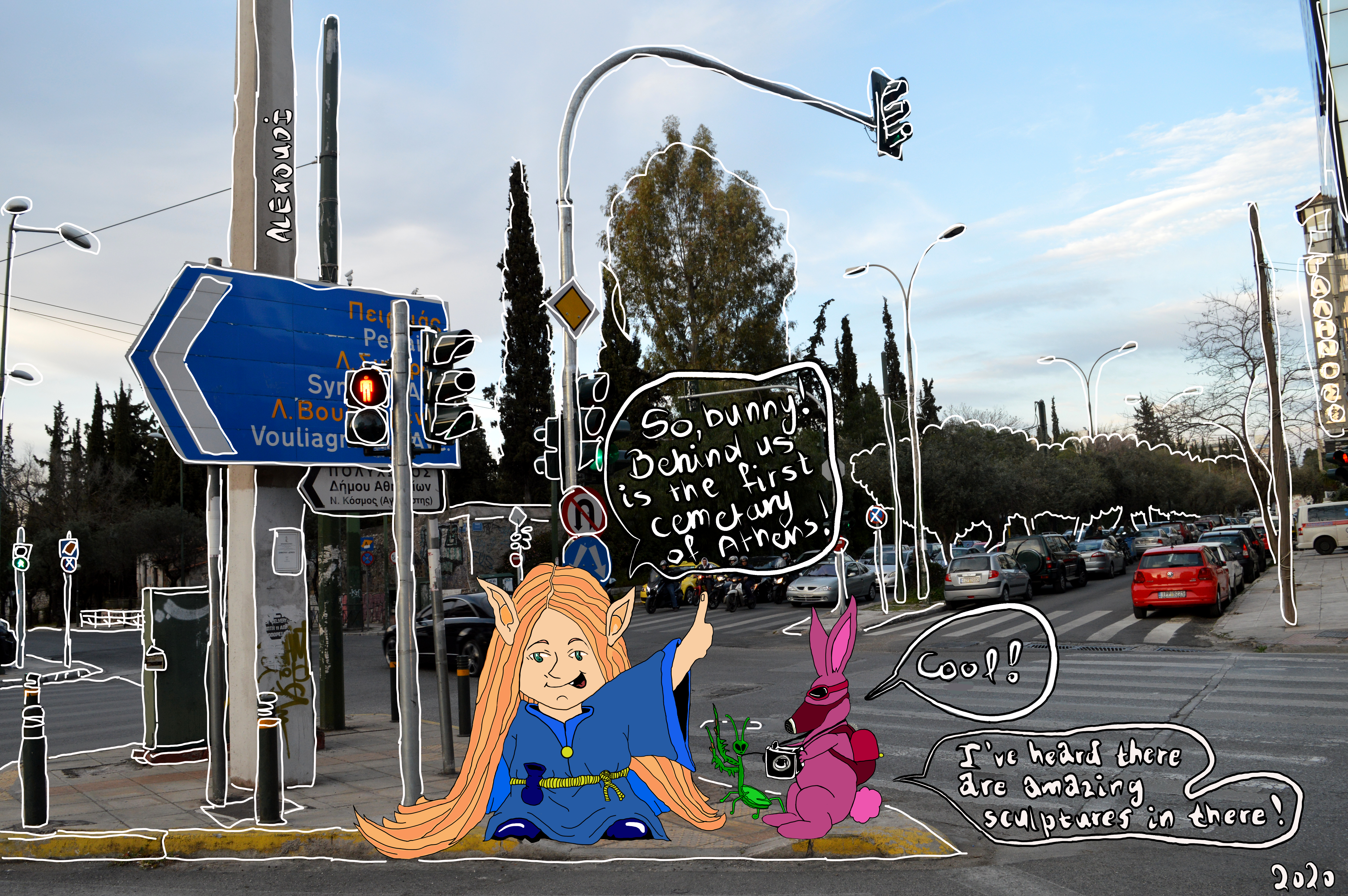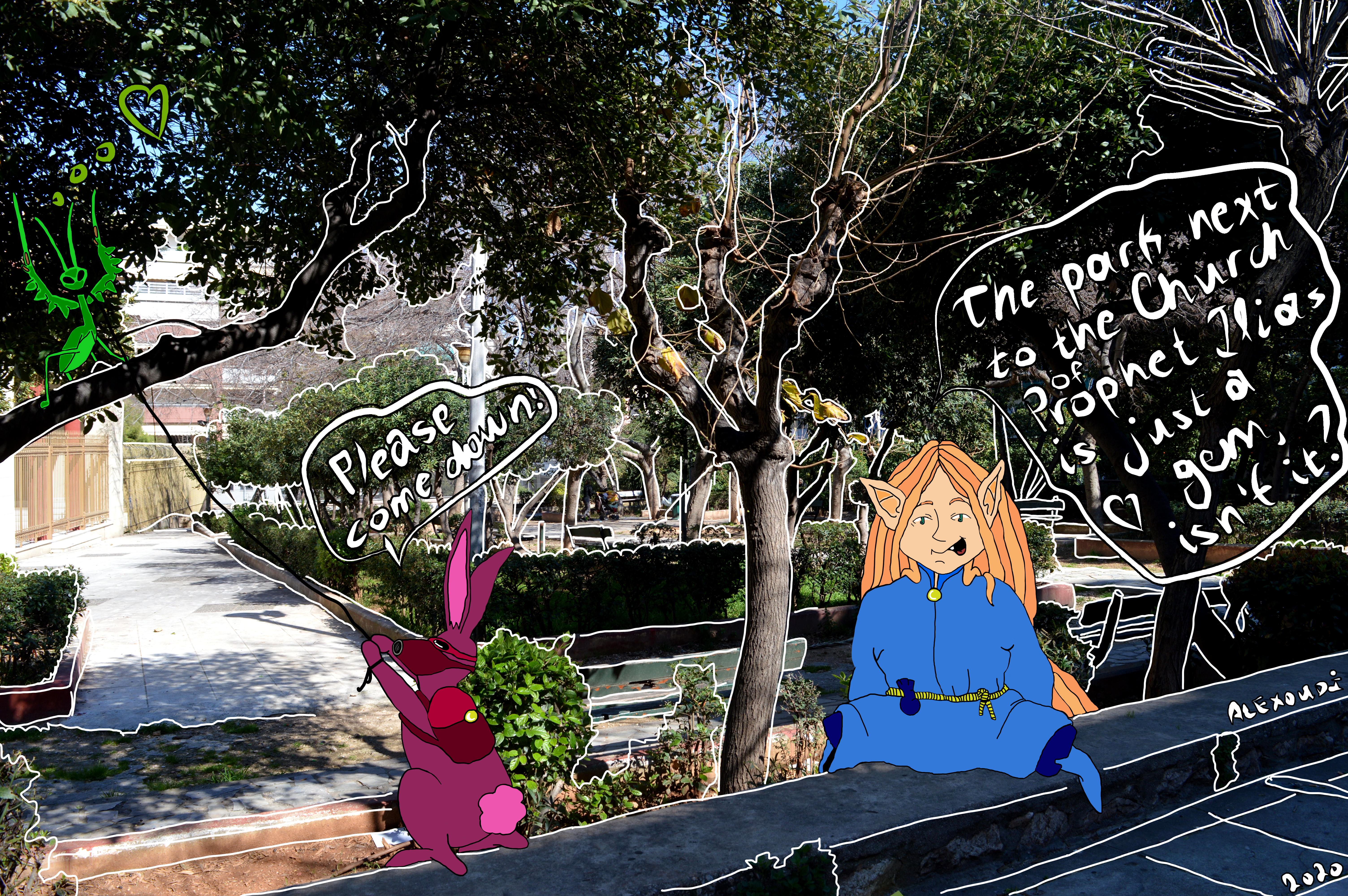 “The Bunny came to Greece for work and is currently living at a small apartment in Agios Artemios district. It has a huge mantis as a pet, mostly because it loves insects but also for protection (people and animals are terrified of the mantis!). The Bunny wanted to find, as soon as possible, small parks to walk its mantis. So, he found an advertisement on the internet about an Elf who was giving small city tours for free. They met at Ilioupoleos Avenue and Imittou Street corner, right outside the First Cemetery of Athens. The Bunny was excited that it was living next to the city’s biggest “Open Museum” (as an article about “open space art” was mentioning)”.
