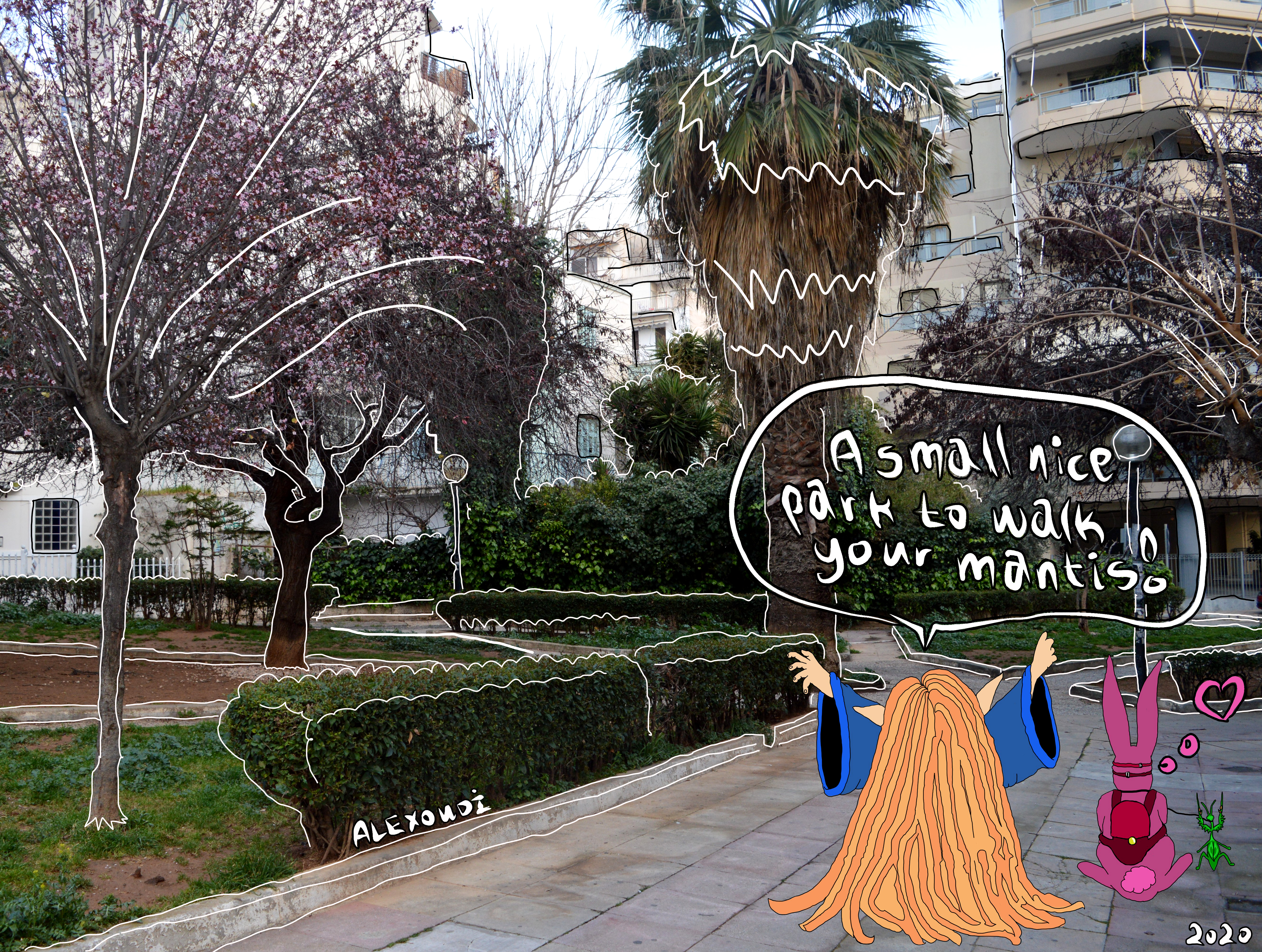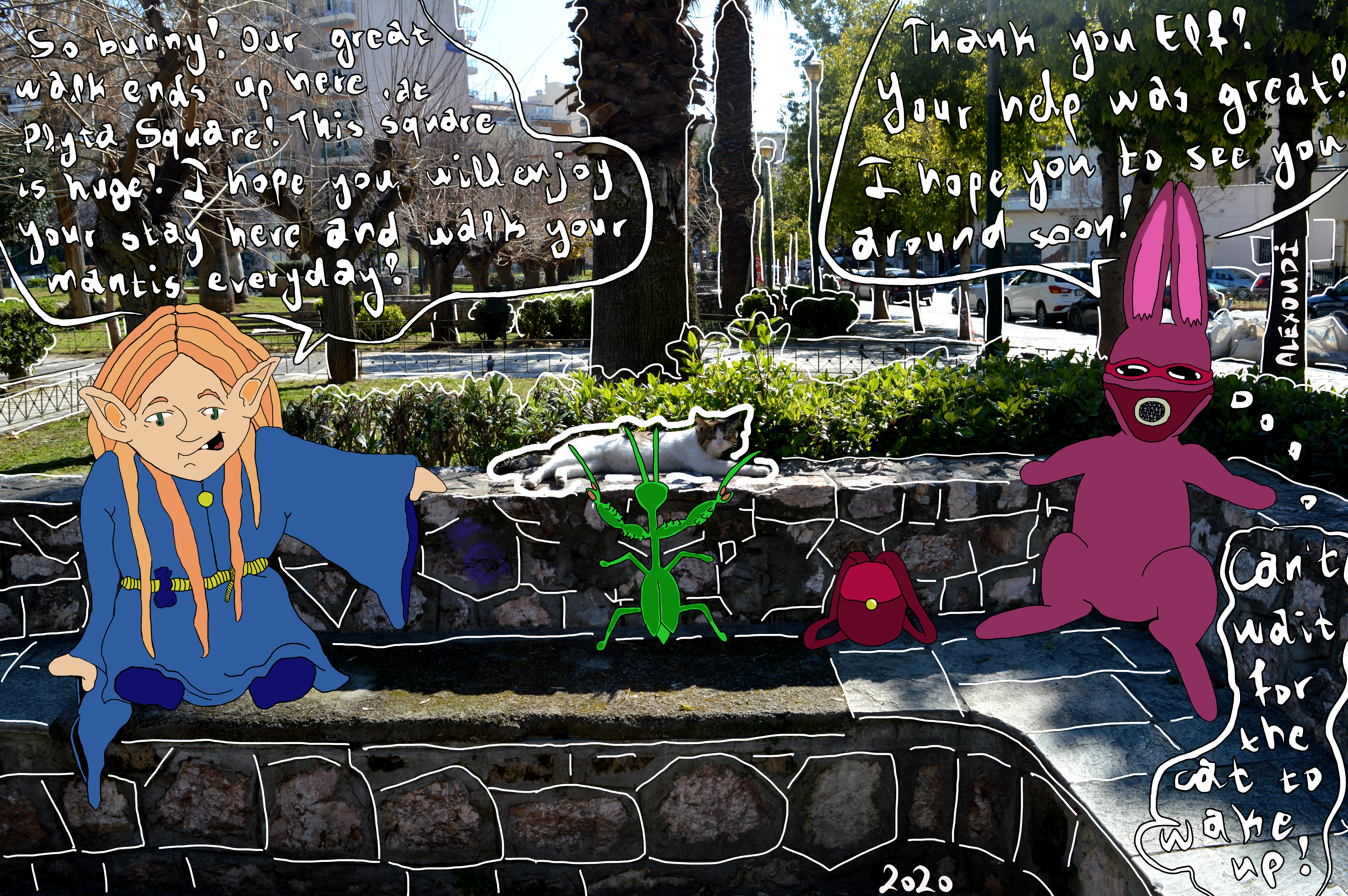 “As they were walking down the Filolaou Street they saw another small park, hidden between some small roads! Its name is “The Square of the Frynonos Street”. The Bunny was tired, because the mantis was extremely energetic. Which of course was only fair, because the poor mantis had a long trip to Greece and the apartment was too small for it to run!”