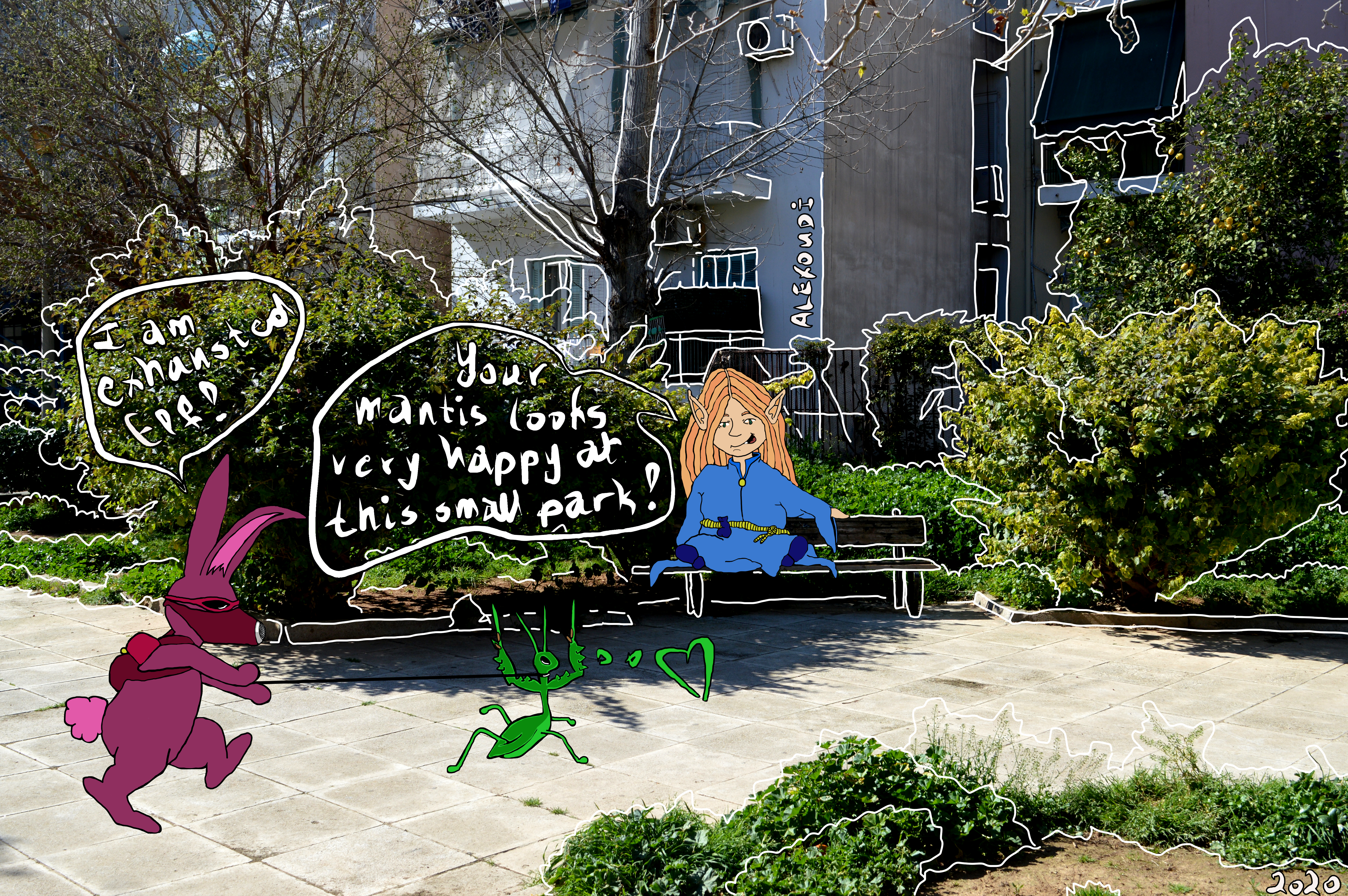 The inspiration came from a route I did for a while quite often. Along this route, there were many small squares and many small parks where various people were walking their pets. Wanting to highlight exactly these small, public breathing spaces in the area, I created a story… something different, where an elf meets a rabbit ( Bunny), who has a Mantis religiosa (Mantis) as its pet. The rabbit, therefore, asks for the elf’s advice, in order to show it the appropriate places in the area where the mantis could walk! And so through 8 photos with sketches, we locate on the map these exact places.